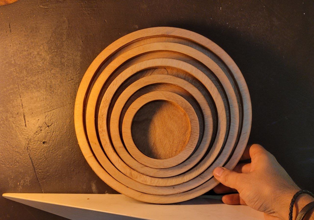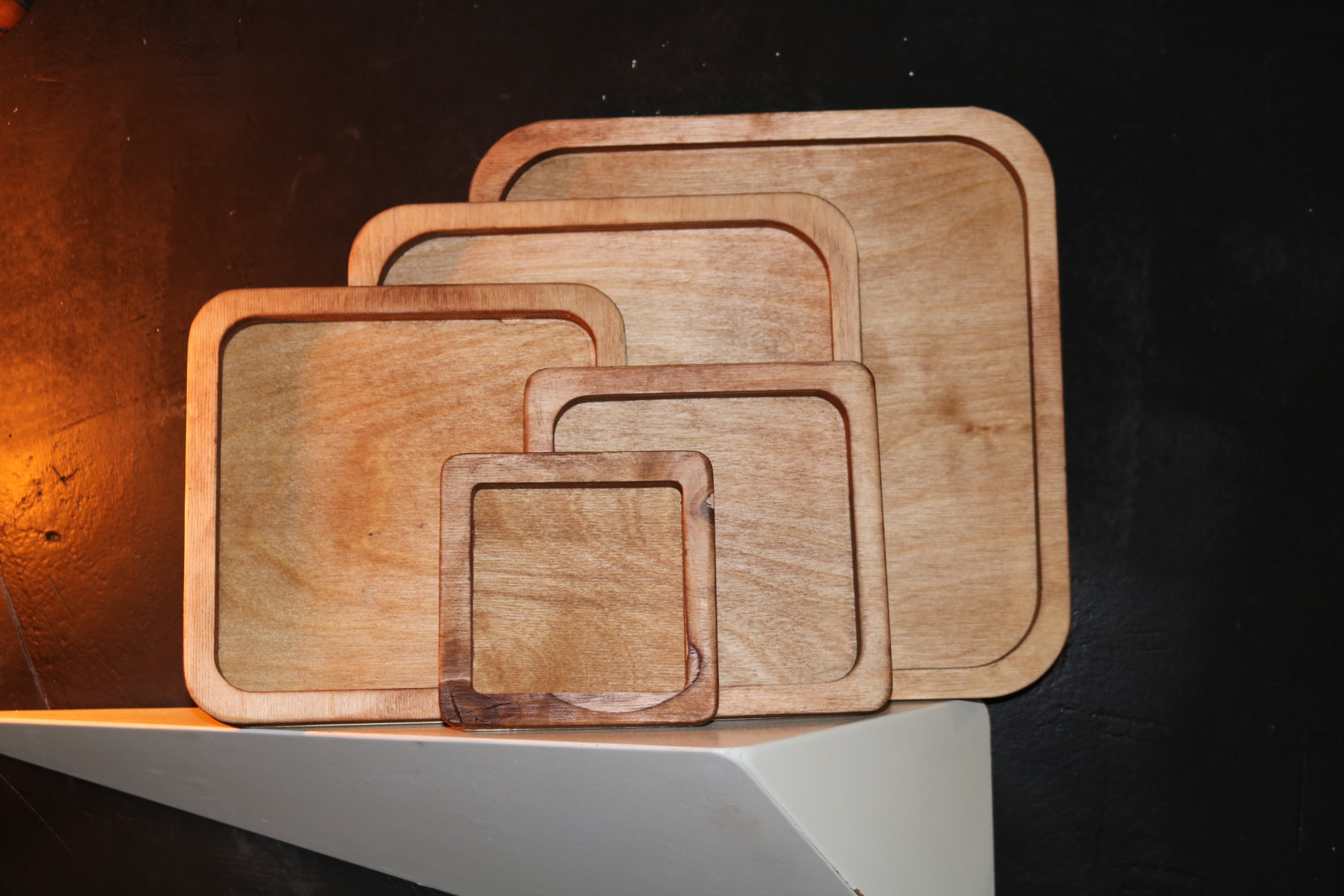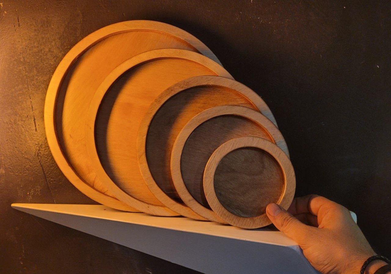 3 مجموعه 5 عددی سینی چوبی دایره مربع مستطیل ( 15 تیکه ) + سینی دایره دسته دار چایی + سینی  مدل گرد02